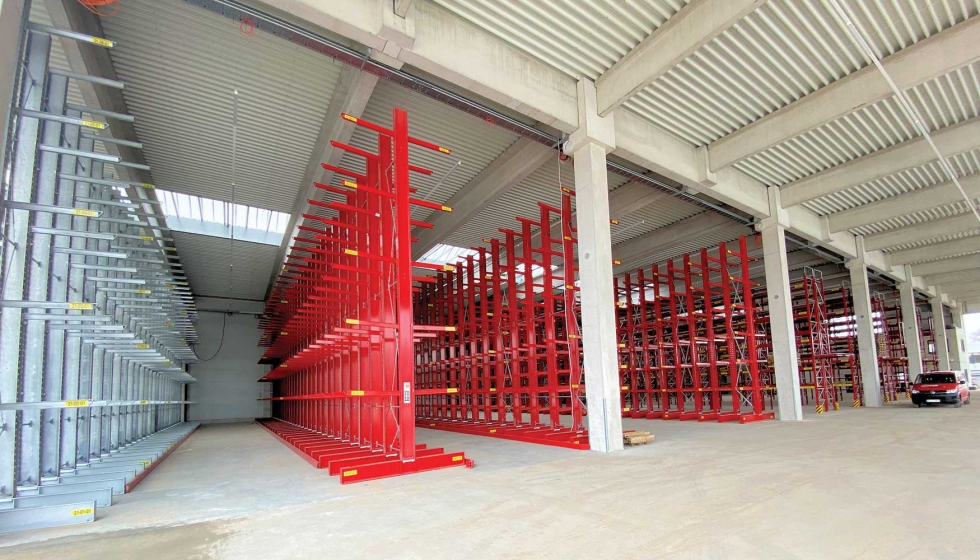 El nuevo sistema combina estanterías cantilever dobles y simples, con alturas de hasta 6 metros y brazos regulables, adaptados para almacenar elementos voluminosos como puertas, ejes, paragolpes, escapes, vigas y bastidores, optimizando al máximo la superficie disponible en el patio exterior y zonas de nave.